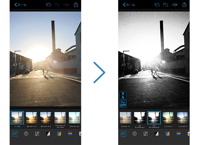 表現の世界を広げる全31種類のフィルターと8種類のエフェクトを使用できます。