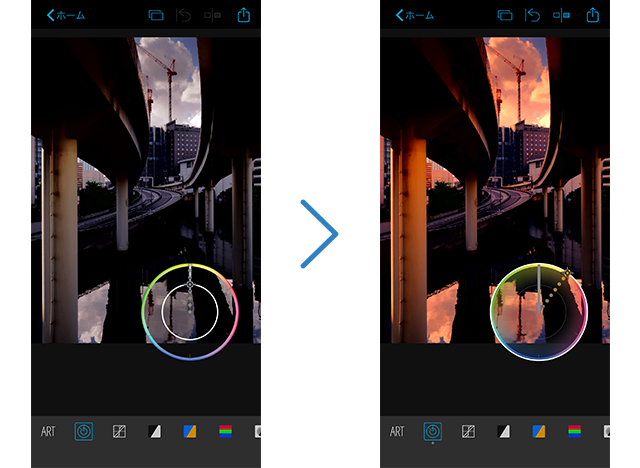 画面に表示されるカラーリングを操作して、強調したい色味の色相(30段階)と彩度(8段階)の調整が直感的に行えます。