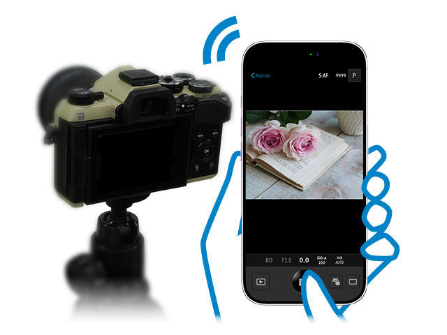 Bij fotograferen op afstand kunt u Live View-afbeeldingen op uw smartphone-beeldscherm bekijken tijdens het uitvoeren van opnametechnieken in Live View en bij Sluiter op afstand kunt u opnameinstellingen op de camera aanpassen terwijl u uw smartphone gebruikt om de sluiter te activeren.