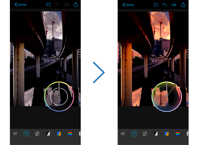 Frame EffectMet Color Creator kunt u de tint en kleurverzadiging aanpassen. Zo geeft u uw foto's een krachtige uitstraling. Gebruik de kleurenring die op het scherm verschijnt voor aanpassing van de kleuren (30 niveaus) en de verzadiging (8 niveaus) van de kleuren in uw foto.